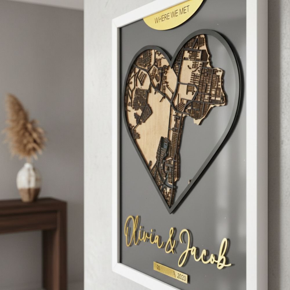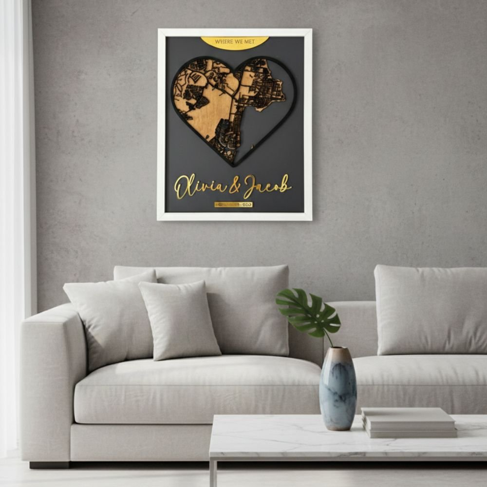 Celebrate your special place and cherished memories with this beautifully crafted, personalized heart-shaped map. This unique piece captures the exact location where your journey together began, making it the perfect gift for anniversaries, weddings, Valentine’s Day, or simply a thoughtful keepsake for your own home.