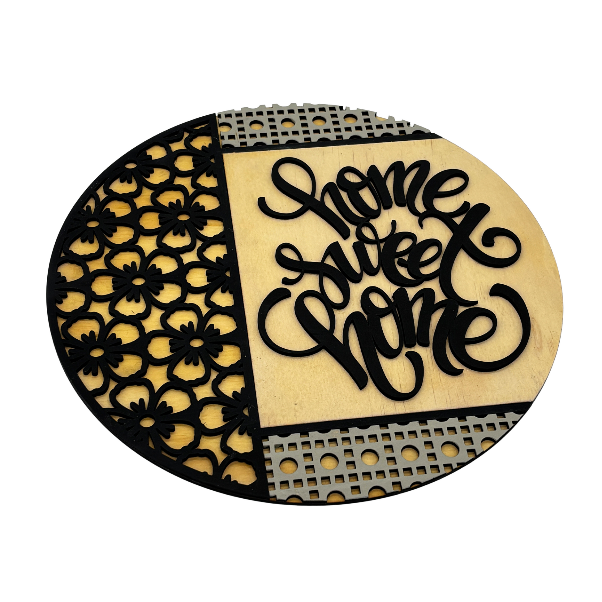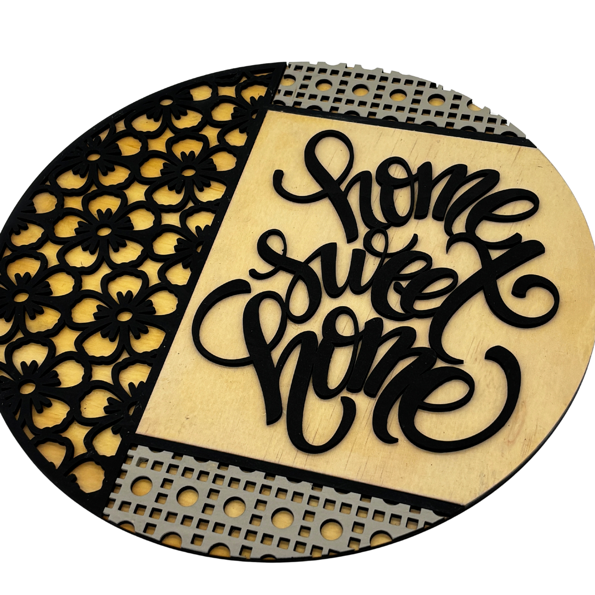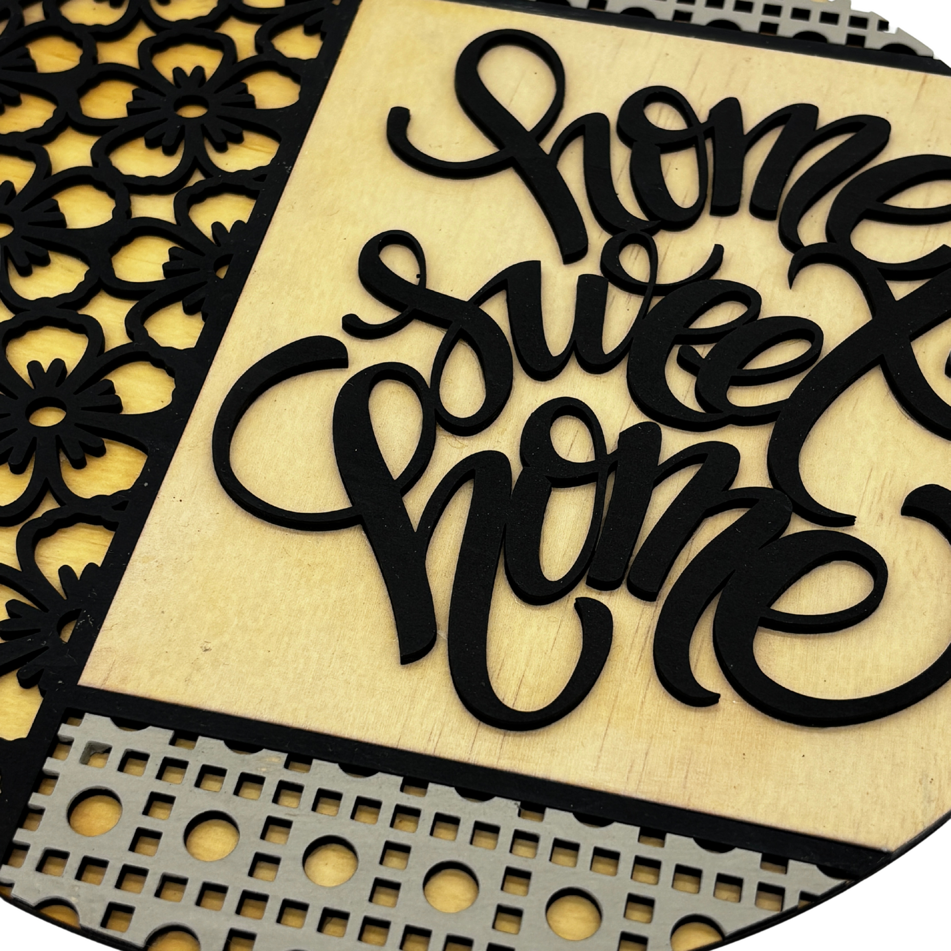 The sign features a bold, flowing script that reads “Home Sweet Home” in rich black lettering, layered over a natural wood background. A striking contrast of textures surrounds the phrase—on one side, a delicate black floral lattice reveals a soft yellow tone beneath, while the opposite edges are accented with modern geometric cutouts in gray and mustard tones, creating a unique blend of rustic and contemporary styles.