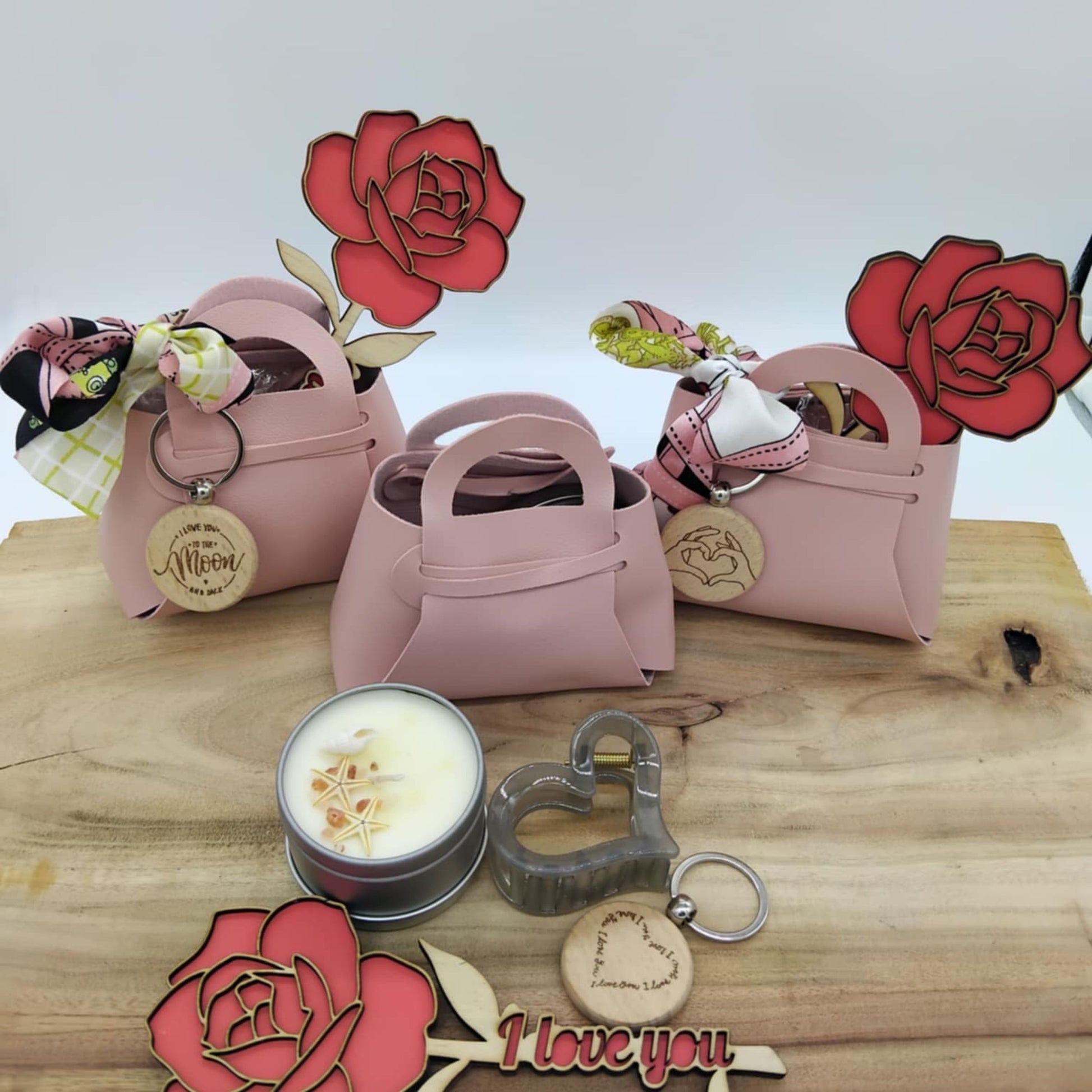 Crafted from soft faux leather, this elegant mini handbags in blush pink are adorned with a stylish patterned scarf for a touch of charm. Each bag comes with a wooden engraved keychain , a delicate hairclip love shape design.
