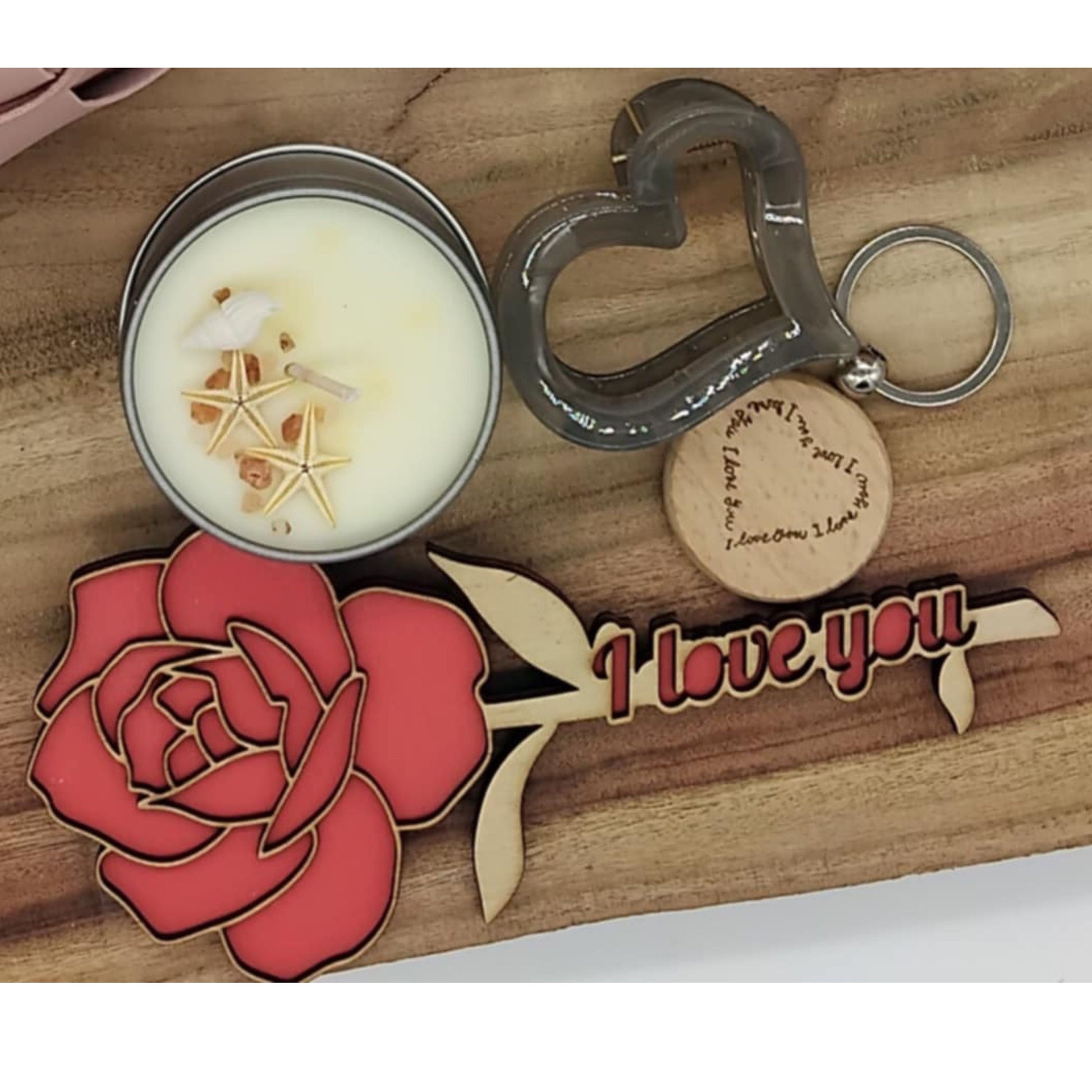 A sleek metal heart-shaped key ring, paired with a round wooden charm engraved with a loving message, adds a personal and practical touch to the gift set.