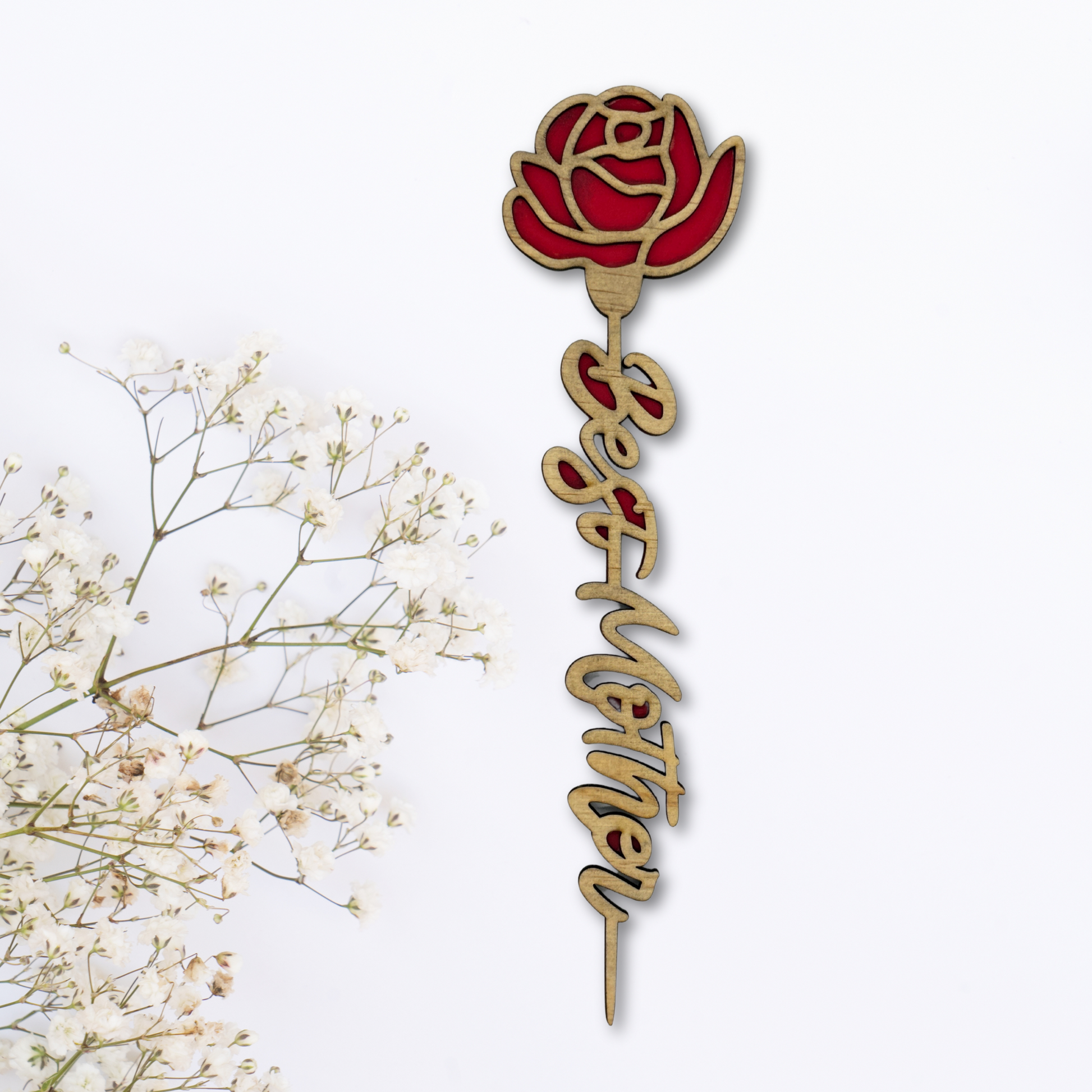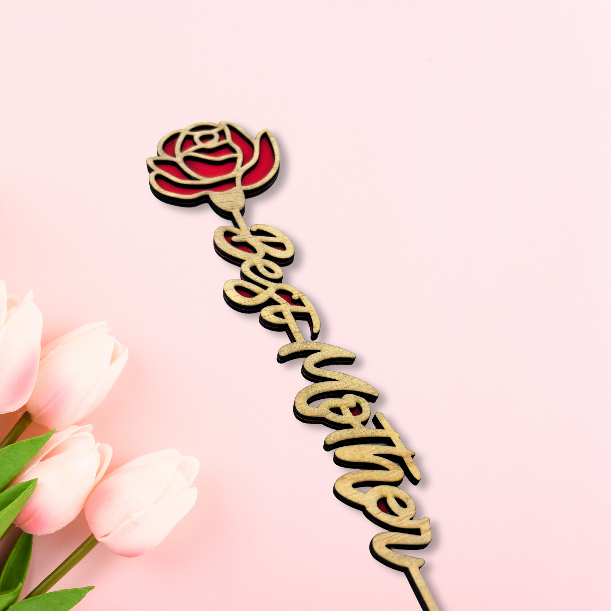 Celebrate Mother’s Day with a gift that lasts forever—this beautifully crafted wooden flower with an elegant “Best Mother” inscription. Designed with precision, this laser-cut decoration features a delicate rose silhouette with a rich red backing, symbolizing love, appreciation, and admiration.