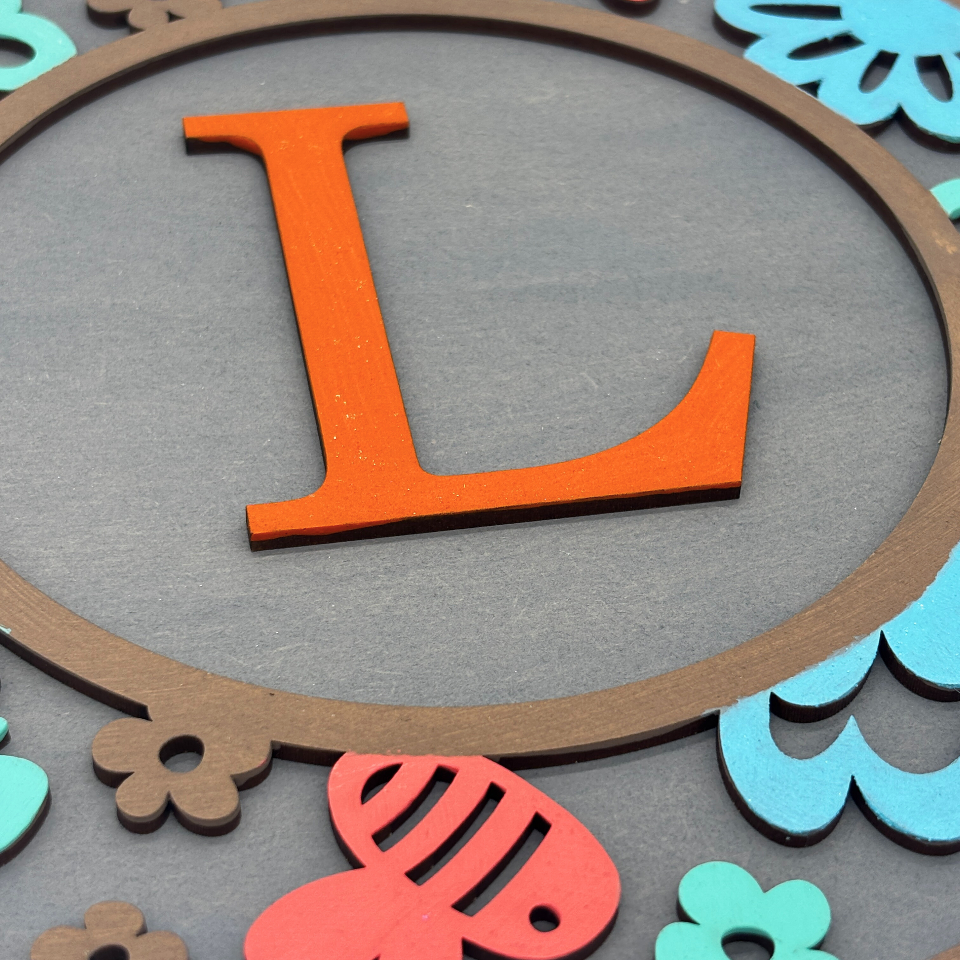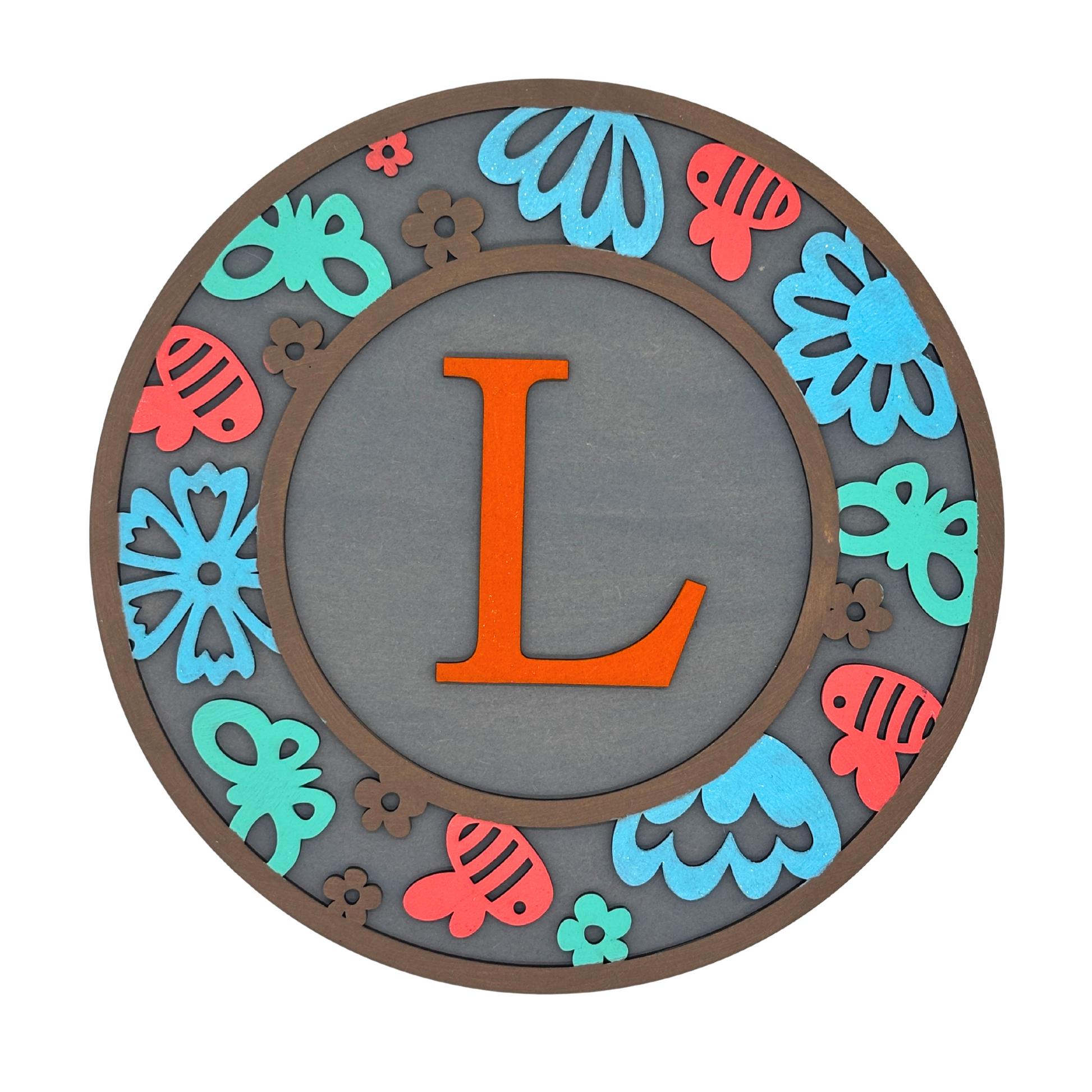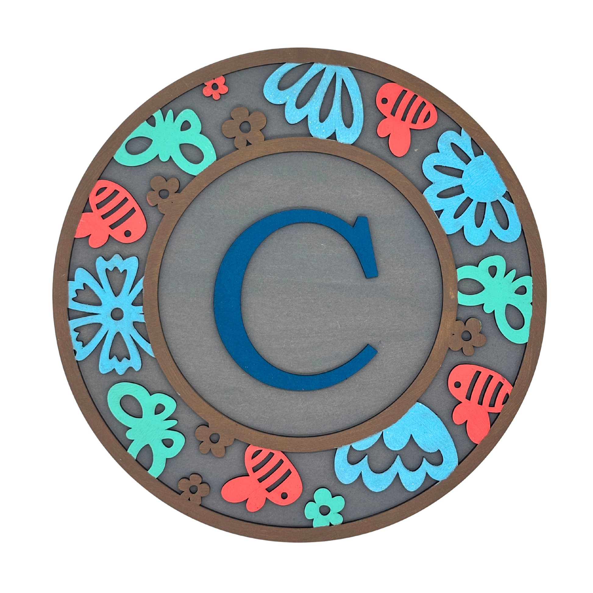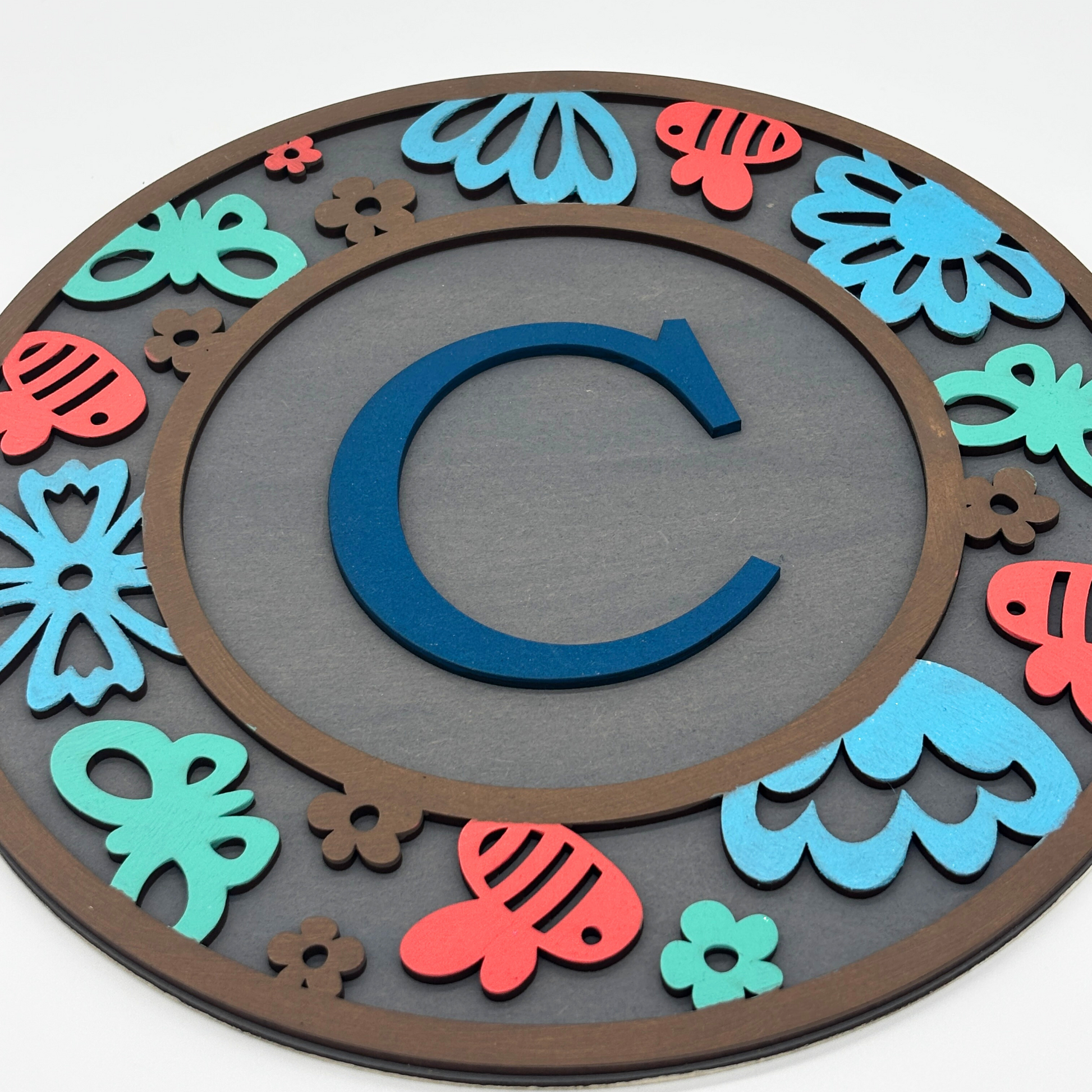 Brighten up your child’s space with this playful and personalised wooden wall sign featuring their initial! Adorned with vibrant butterflies, flowers, and fun shapes in cheerful tones of red, blue, and green, this charming round sign adds a personalised and joyful touch to any kids' room, playroom, or nursery. Made from high-quality wood and precision laser-cut, it's a unique gift idea that celebrates individuality and creativity.